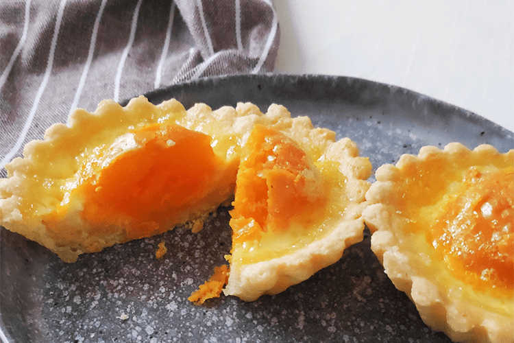 「哇!好可愛!」這個甜點出爐的時候,我忍不住發出讚嘆,嘴角滿滿都是笑意。嫩黃色的蛋塔滾著小花邊,裡面是一大顆圓潤亮橘色鹹蛋黃,像是個戴著花俏太陽眼鏡的小女孩。