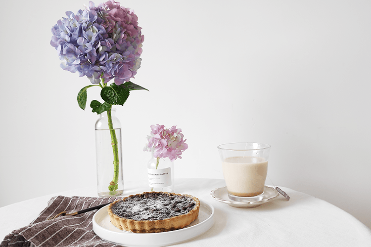 我在上面灑了一點糖粉裝飾,切開時可以看到抹茶與紅豆的夾心,盛在濃厚奶香的金黃餅皮上,這天的餐桌還妝點了新鮮的藍紫色繡球花,深深覺得這樣美好的下午茶就是真愛。