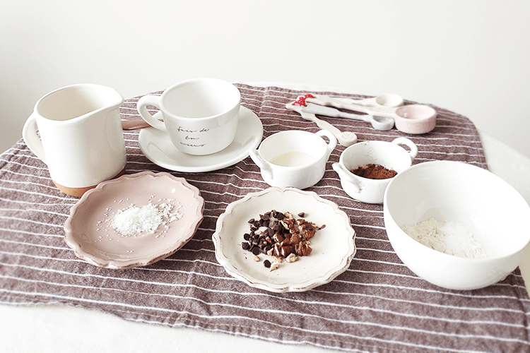 從櫃子裡拿出白色的陶瓷咖啡杯,把所有的材料加進杯子攪一攪,最後灑上巧克力豆跟堅果碎,放進微波爐讓平凡無奇的麵糊變成美味的巧克力蛋糕吧!