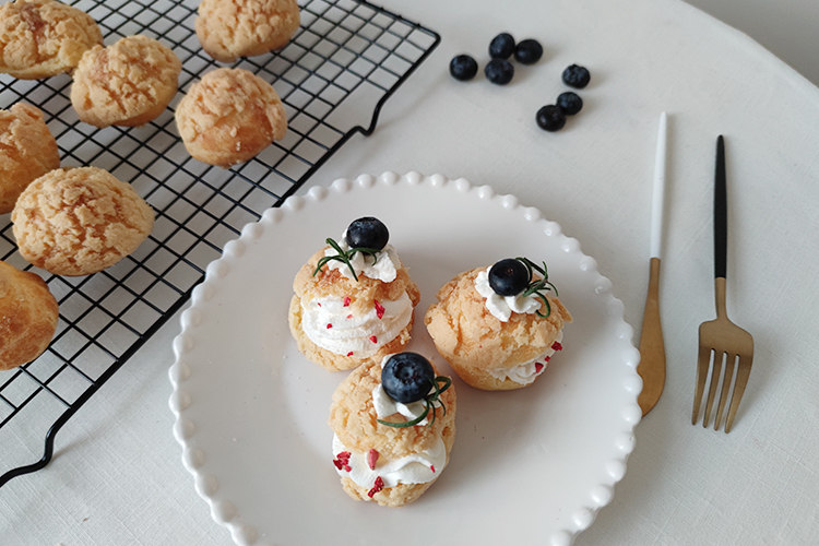 酥皮泡芙是個好適合一人食的甜點,份量小巧又非常有滿足感,搭配不同口味的奶油就是一種新滋味。當一口咬下爆出滿滿的鮮奶油,那種自然而發的笑容是最珍貴的。
